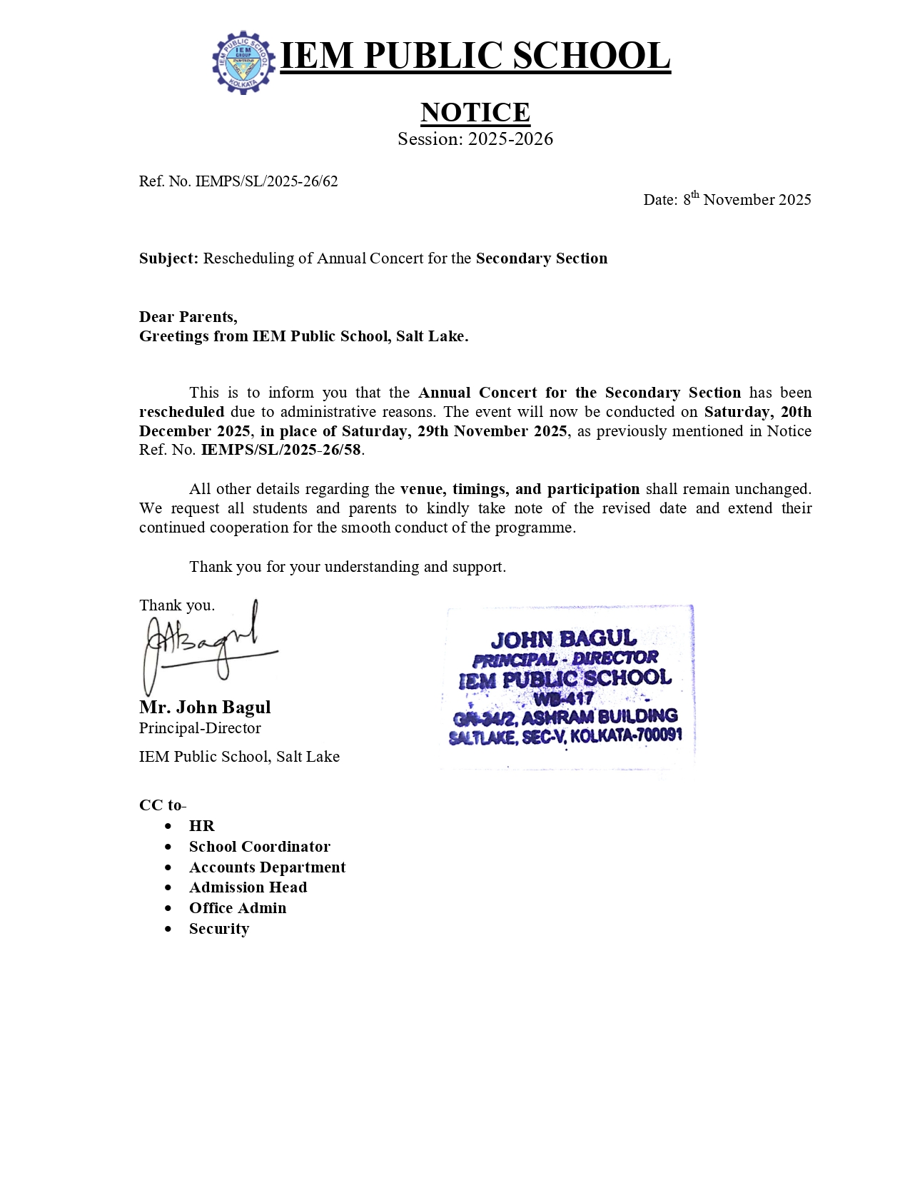 Notice 62 – Regarding RESCHEDULED OF ANNUAL CONCERT (SECONDARY SECTION)