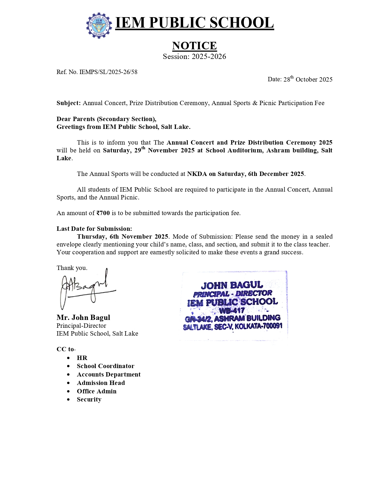 Notice No. 57 – Annual Concert, Prize Distribution Ceremony, Annual Sports & Picnic Participation Fee (GE)