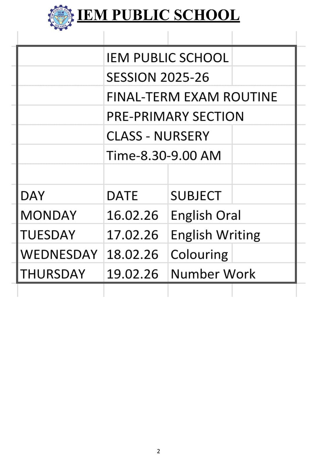 Final Exam Time Table 2025 – 2026 (Play Group & Nursery)