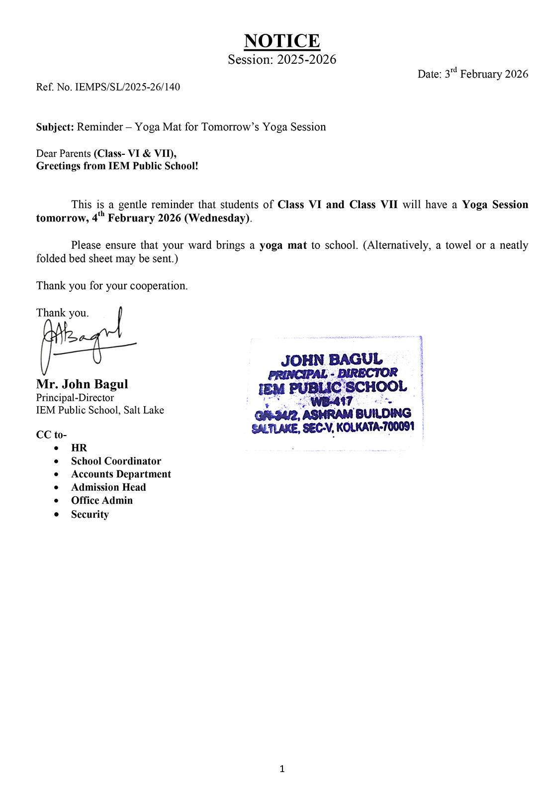 Yoga Session for Class VI & VII