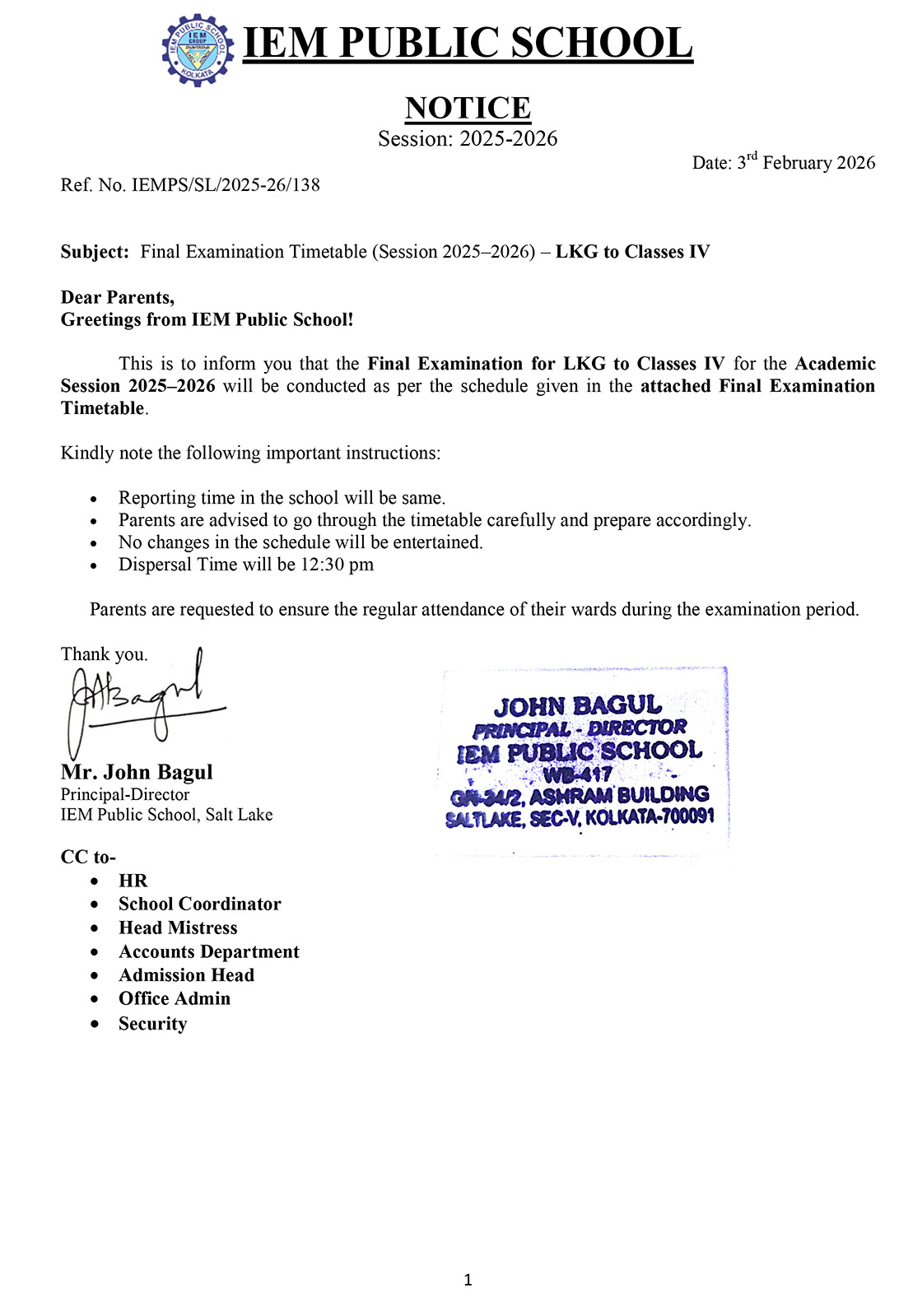Final Exam Time Table 2025 – 2026 (LKG to Class IV)