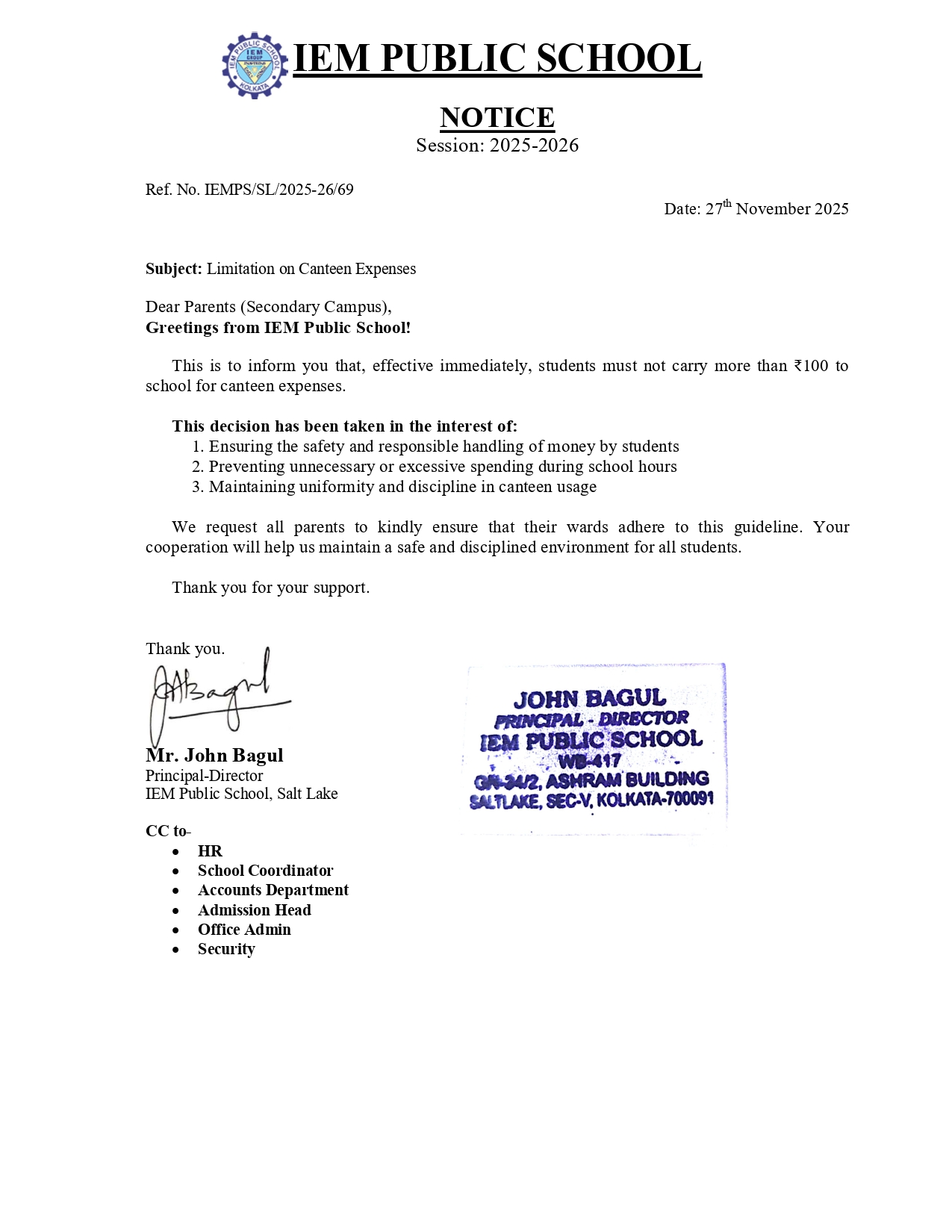 Notice for students regarding limitation on Canteen Expenses