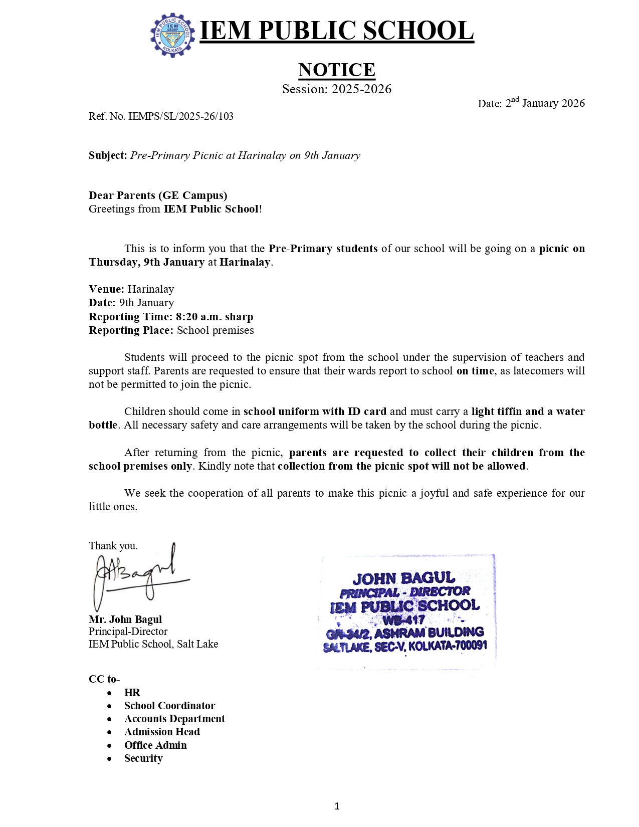 NOTICE REGARDING PICNIC OF PRE-PRIMARY STUDENTS