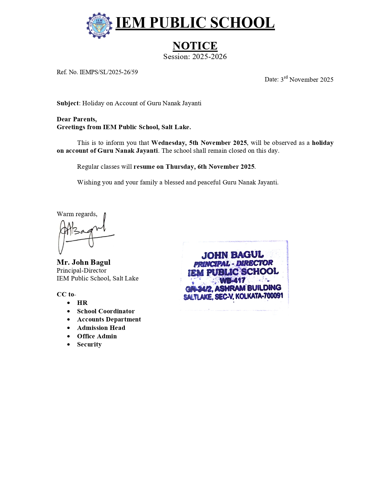 NOTICE 59 – HOLIDAY ON BEHALF OF GURU NANAK JAYANTI