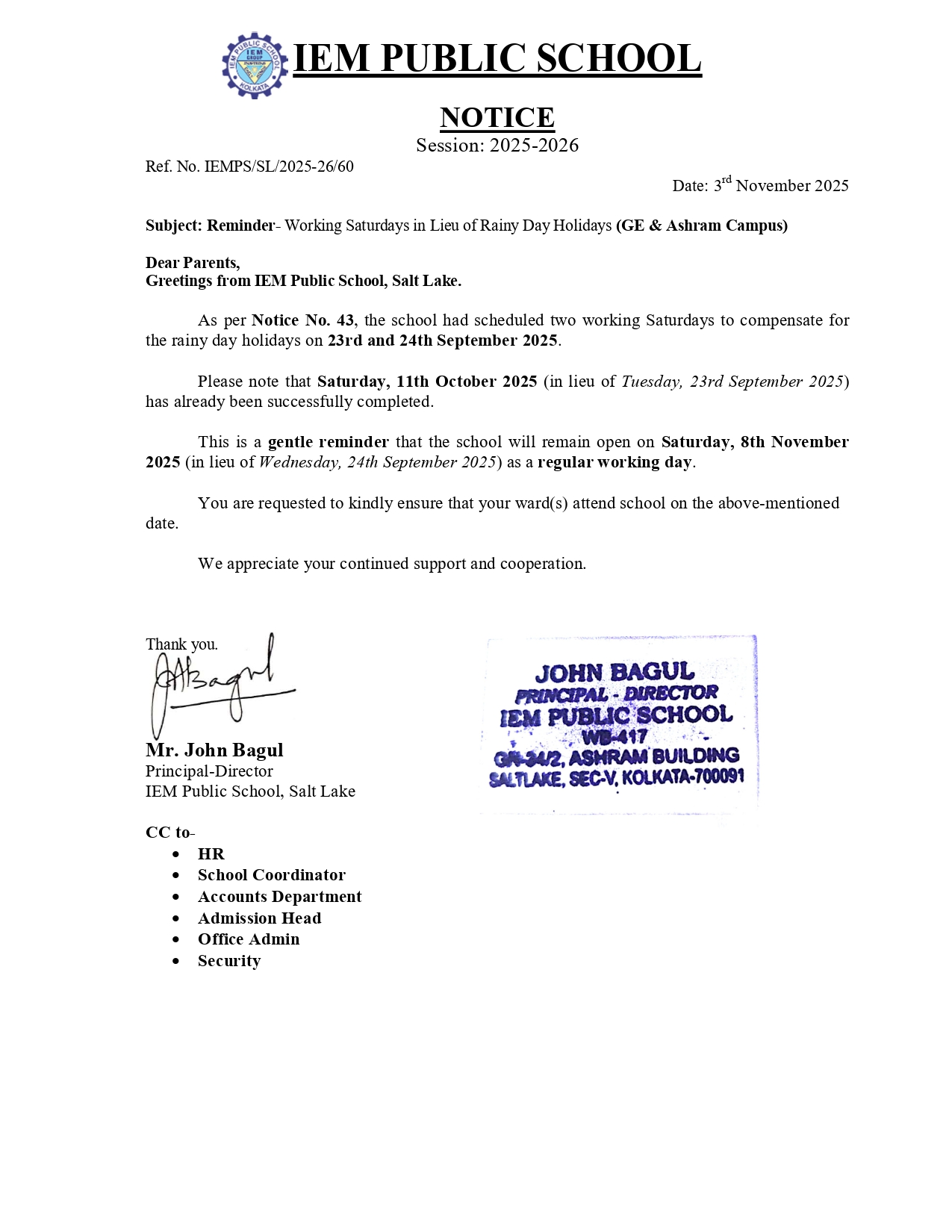 NOTICE – Working saturday in lieu of Rainy day holidays